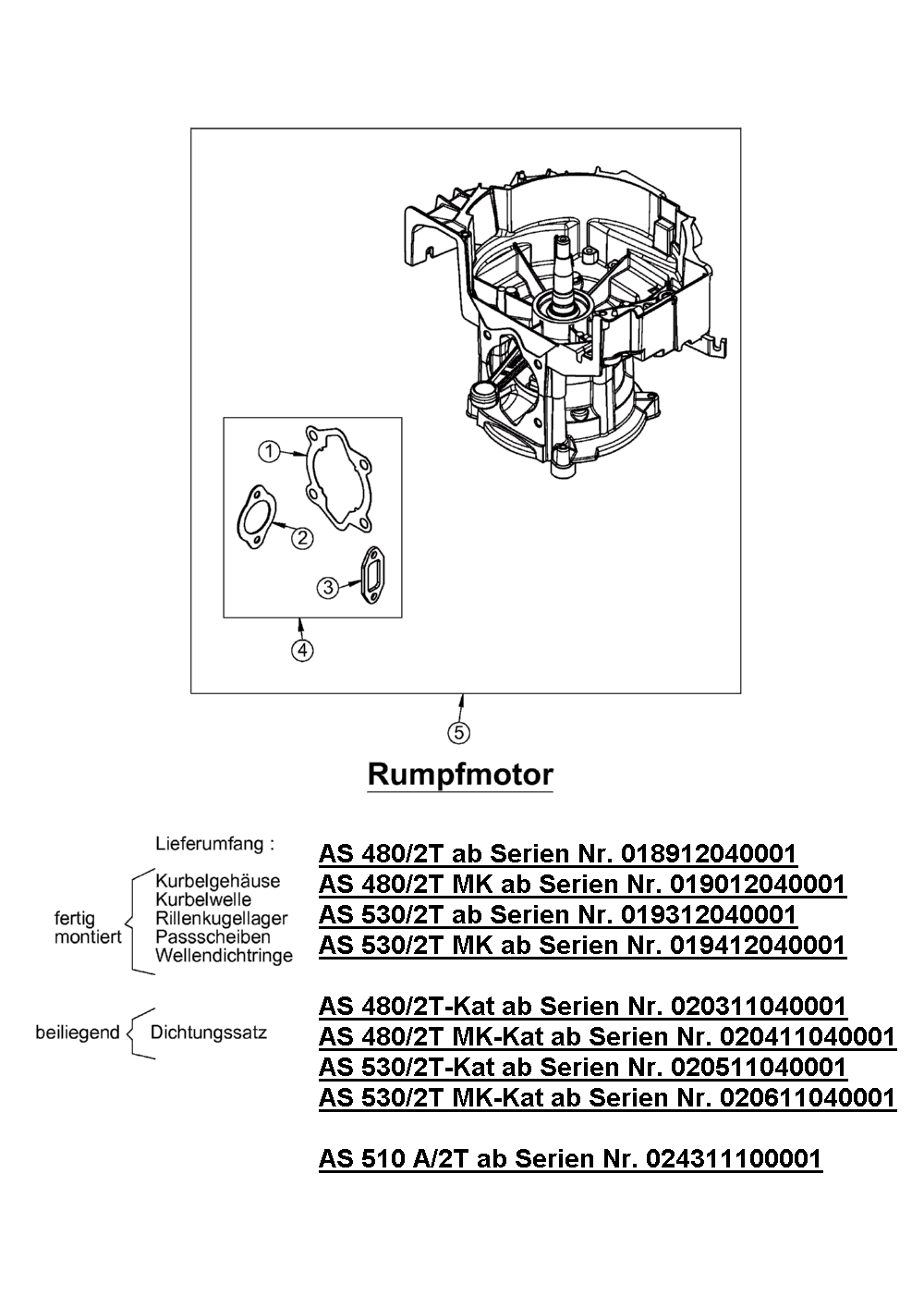 Hier finden Sie alle Ersatzteile von AS-Motor Profi-Rasenmäher AS 530/2T MK-Kat ab FNr. 020611040001 aus dem Zeichnungsblatt Rumpfmotor: