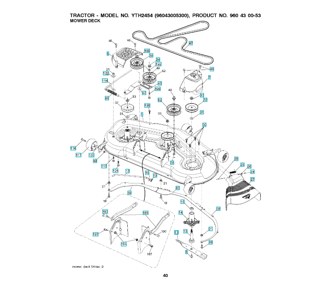 Folgende Ersatzteile für Husqvarna Gartentraktor YTH2454 ( 96043005300, 2007-12 ) SCHNEIDWERK/MÄHDECK können Sie hier bestellen: