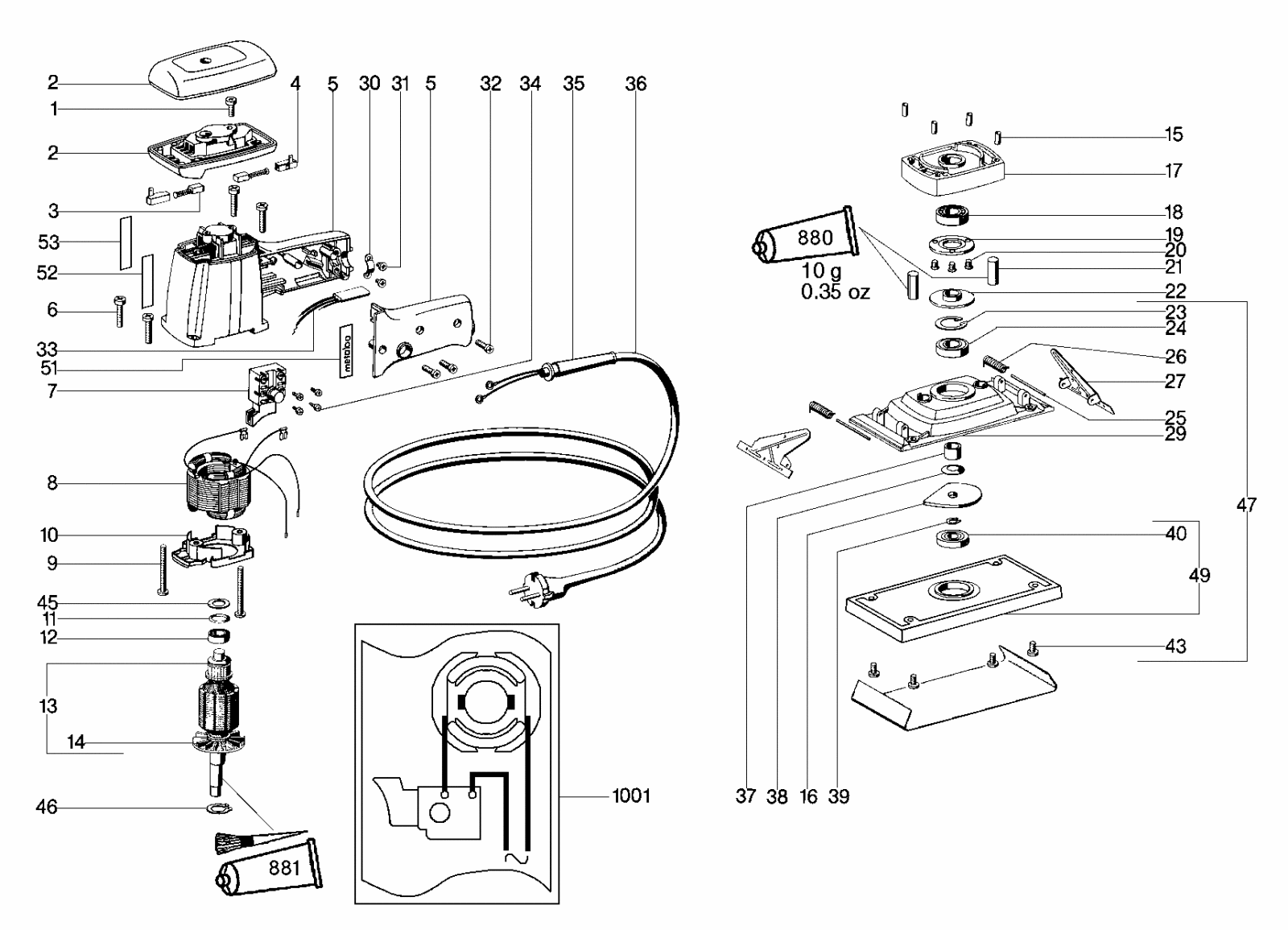 Zeichnung 1 Sollten Sie Fragen zu einem Ersatzteil von Metabo SR 4320 Schwingschleifer 604320001 haben, können Sie uns gerne eine E-Mail (mit einem Foto vom Typenschild Ihres Gerätes) schreiben oder eine Ersatzteilanfrage stellen.