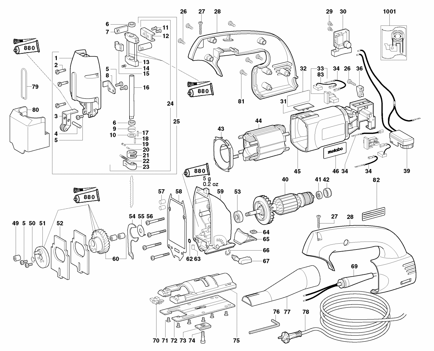 Zeichnung 1 Sollten Sie Fragen zu einem Ersatzteil von Metabo STEB 105 Plus Stichsäge 610600380 haben, können Sie uns gerne eine E-Mail (mit einem Foto vom Typenschild Ihres Gerätes) schreiben oder eine Ersatzteilanfrage stellen.