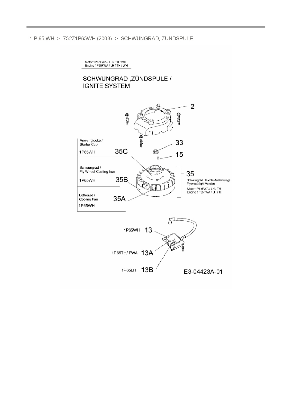 Ersatzteile für Vertikal MTD-Motoren 1 P 65 WH aus der Zeichnung Schwungrad, Zündspule: