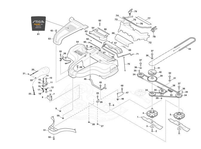 Zeichnungen von Stiga Frontaufsitzmäher Park Mähdecks mit Geräte Nr. 2D6210021/ST1 ab Baujahr 2021
