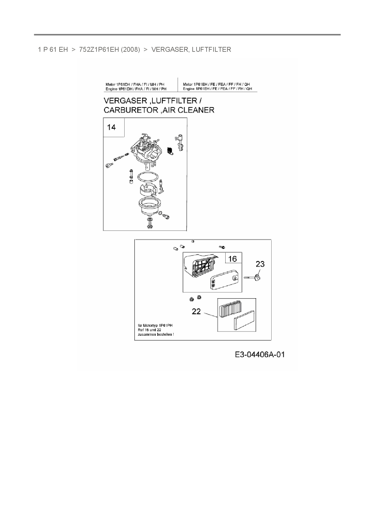 Ersatzteile für Vertikal MTD-Motoren 1 P 61 EH aus der Zeichnung Vergaser, Luftfilter: