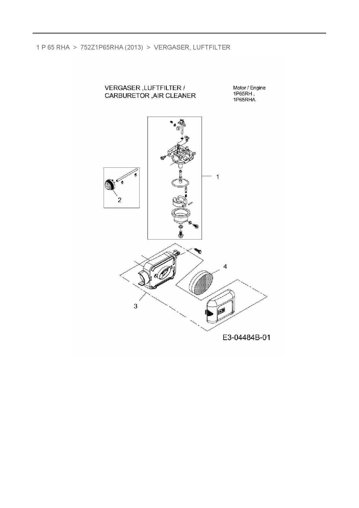 Download Ersatzteil-Zeichnung MTD-Motoren 1 P 65 RHA Zeichnung Vergaser, Luftfilter (PDF-Format)