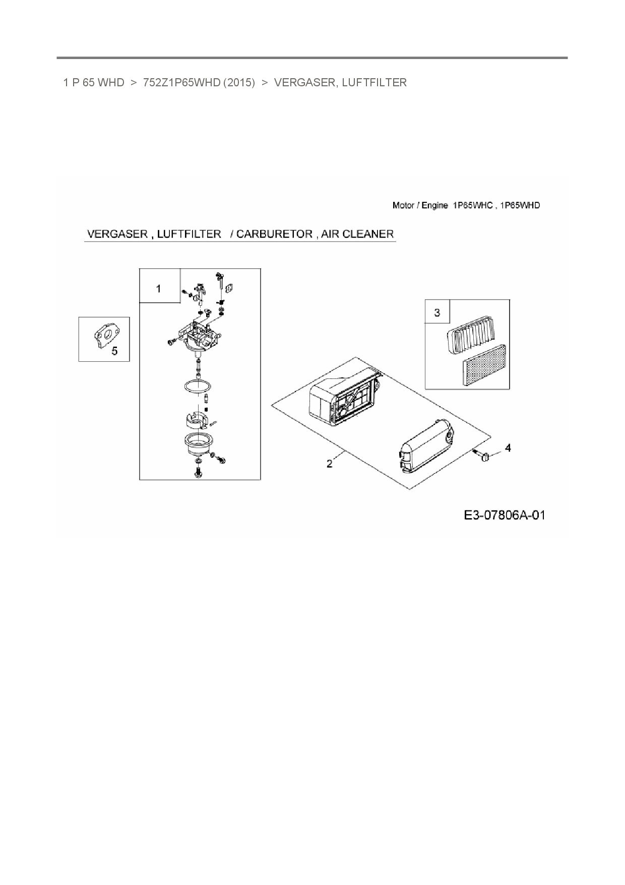 Download Ersatzteil-Zeichnung MTD-Motoren 1 P 65 WHD Zeichnung Vergaser, Luftfilter (PDF-Format)