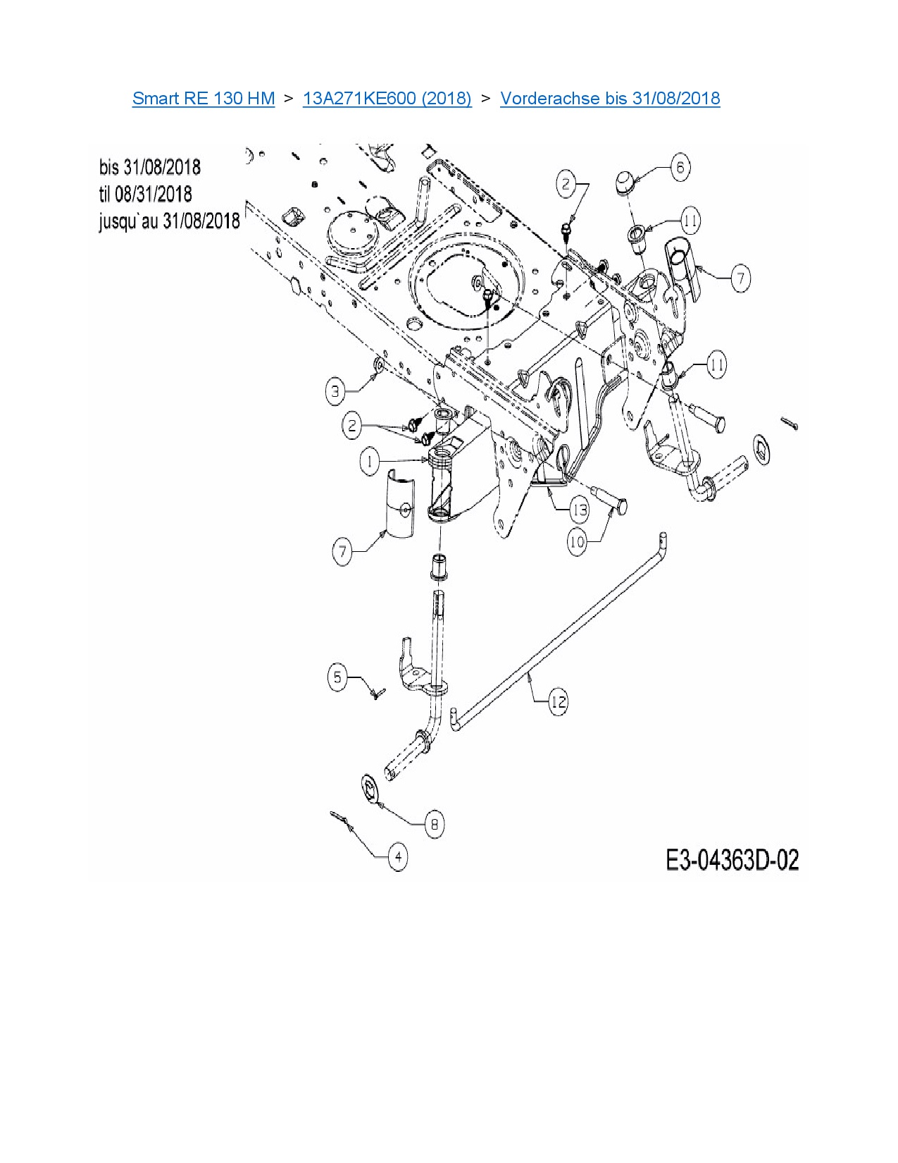 Ersatzteile für Rasentraktor MTD Smart RE 130 HM aus der Zeichnung Vorderachse bis 31/08/2018: