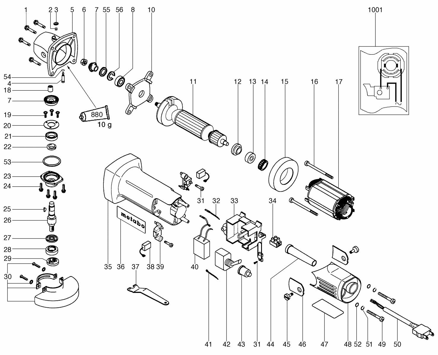 Zeichnung 1 Sollten Sie Fragen zu einem Ersatzteil von Metabo W 6-100 Winkelschleifer 606260310 haben, können Sie uns gerne eine E-Mail (mit einem Foto vom Typenschild Ihres Gerätes) schreiben oder eine Ersatzteilanfrage stellen.