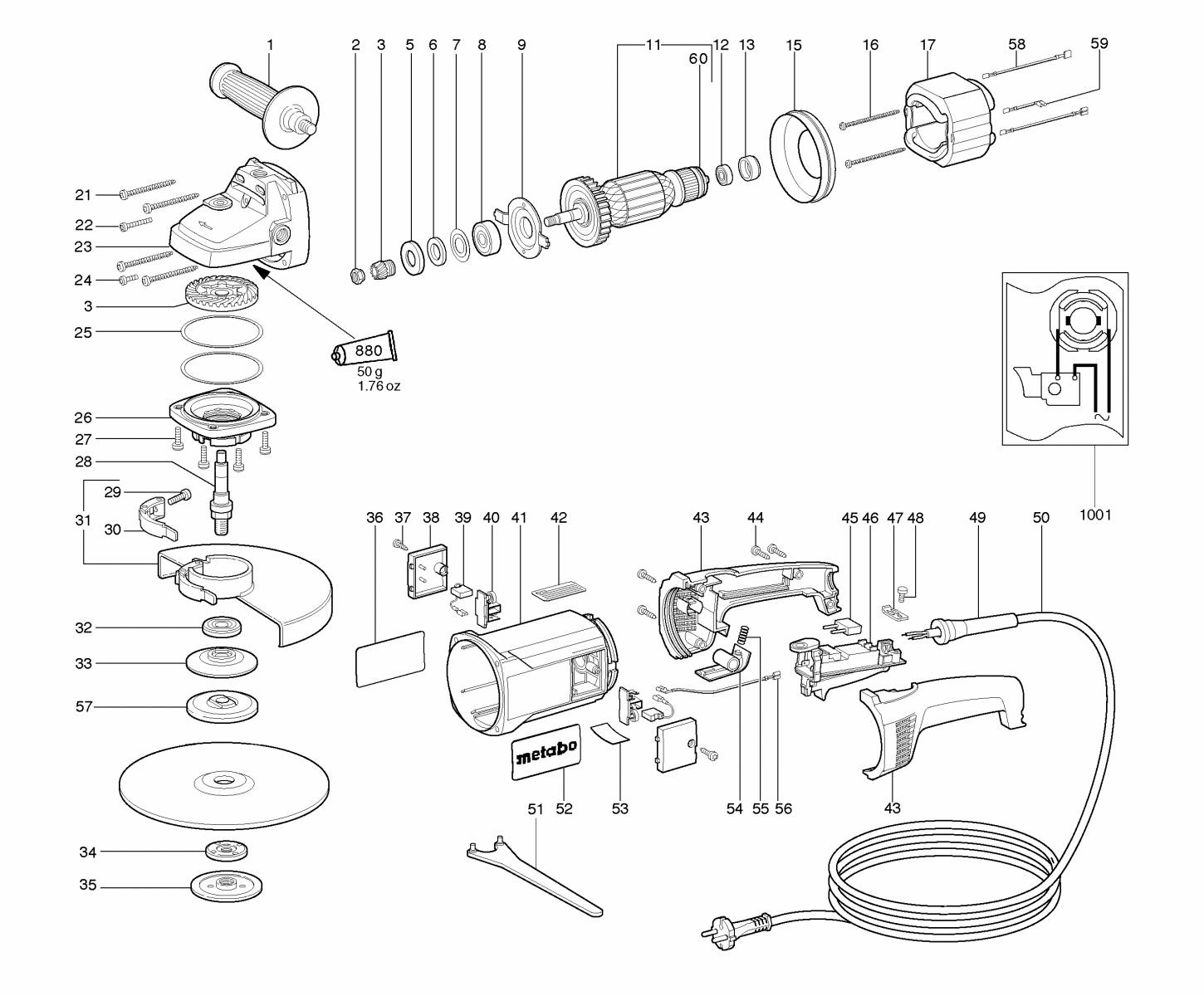 Zeichnung 1 Sollten Sie Fragen zu einem Ersatzteil von Metabo W 75 Winkelschleifer 607775190 haben, können Sie uns gerne eine E-Mail (mit einem Foto vom Typenschild Ihres Gerätes) schreiben oder eine Ersatzteilanfrage stellen.