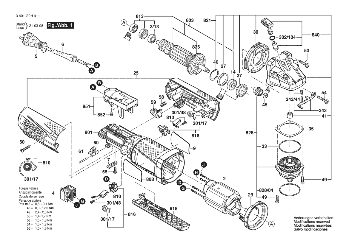 Zeichnung Sollten Sie Fragen zu einem Ersatzteil vom Bosch Winkelschleifer GWS 13-50VSP | 120 V | 061 - US (3 601 G9H 411) haben, können Sie uns gerne eine E-Mail (mit einem Foto vom Typenschild Ihres Gerätes) schreiben oder eine Ersatzteilanfrage stellen.