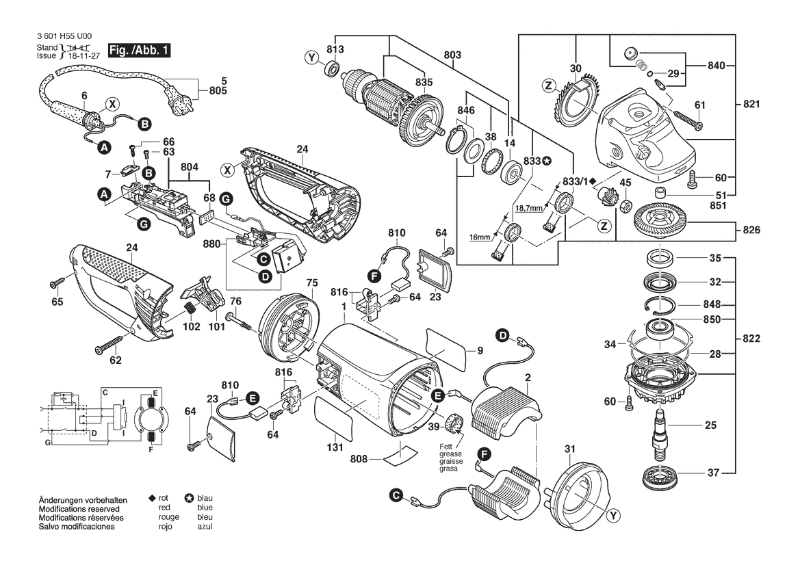 Zeichnung Sollten Sie Fragen zu einem Ersatzteil vom Bosch Winkelschleifer GWS 26-180 JBV | 230 V | 001 - EU (3 601 H55 U00) haben, können Sie uns gerne eine E-Mail (mit einem Foto vom Typenschild Ihres Gerätes) schreiben oder eine Ersatzteilanfrage stellen.