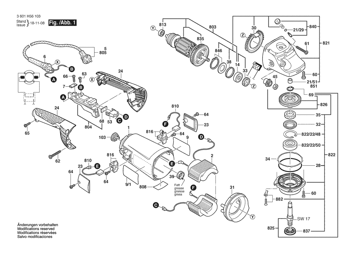 Zeichnung Sollten Sie Fragen zu einem Ersatzteil vom Bosch Winkelschleifer GWS 26-230 H | 230 V (3 601 H56 103) haben, können Sie uns gerne eine E-Mail (mit einem Foto vom Typenschild Ihres Gerätes) schreiben oder eine Ersatzteilanfrage stellen.
