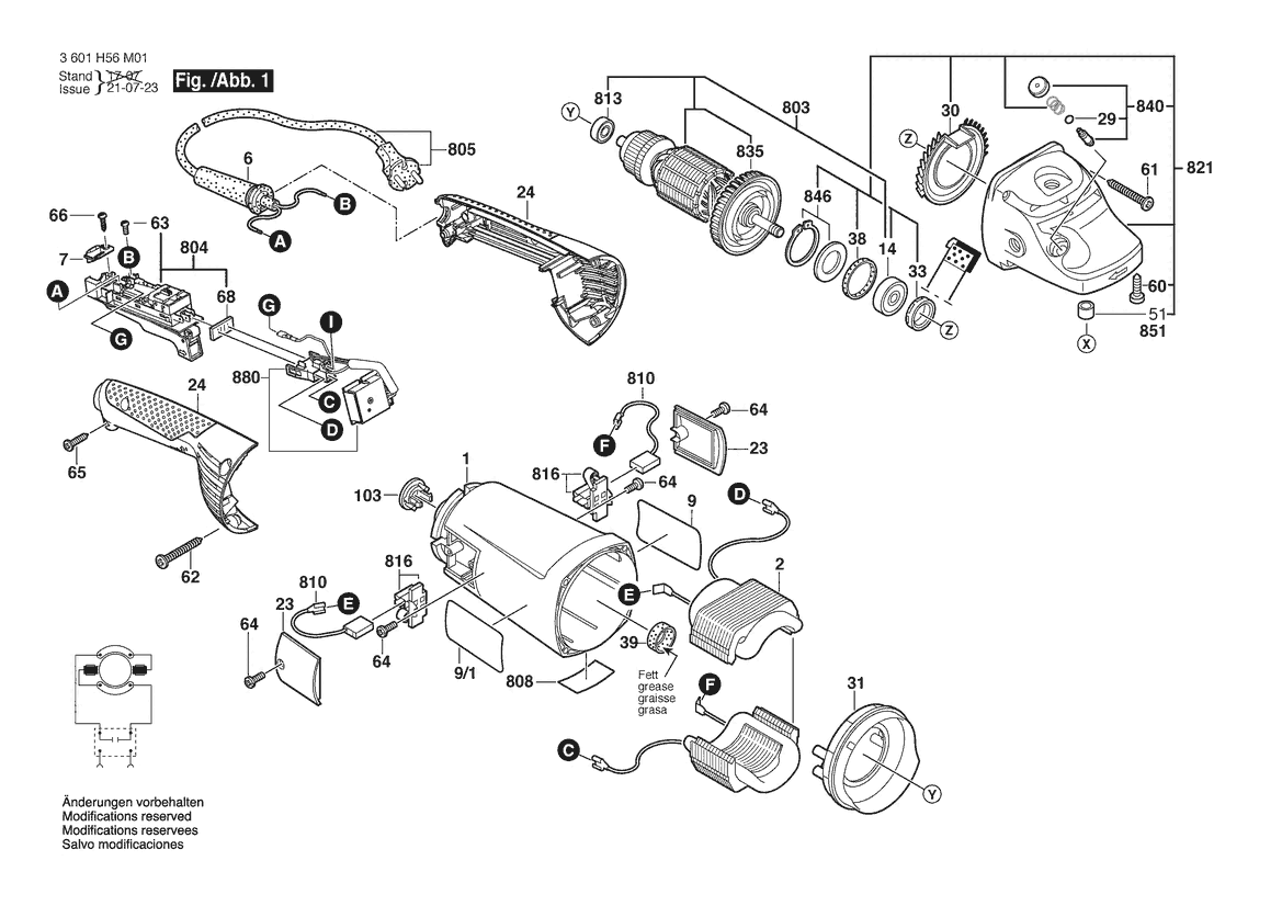 Zeichnung Sollten Sie Fragen zu einem Ersatzteil vom Bosch Winkelschleifer GWS 26-230 JH | 230 V | 001 - EU (3 601 H56 M01) haben, können Sie uns gerne eine E-Mail (mit einem Foto vom Typenschild Ihres Gerätes) schreiben oder eine Ersatzteilanfrage stellen.