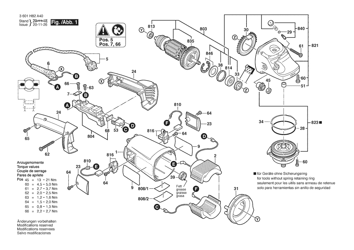 Zeichnung Sollten Sie Fragen zu einem Ersatzteil vom Bosch Winkelschleifer GWS 22 | 240 V | 027 - AU (3 601 H82 A40) haben, können Sie uns gerne eine E-Mail (mit einem Foto vom Typenschild Ihres Gerätes) schreiben oder eine Ersatzteilanfrage stellen.