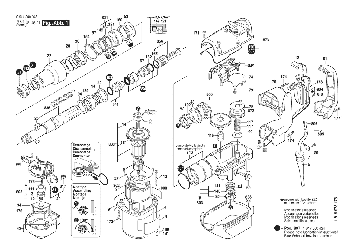 Zeichnung Sollten Sie Fragen zu einem Ersatzteil vom Bosch Bohrhammer GBH 5-38 D | 220 V | 011 - KR (0 611 240 040) haben, können Sie uns gerne eine E-Mail (mit einem Foto vom Typenschild Ihres Gerätes) schreiben oder eine Ersatzteilanfrage stellen.