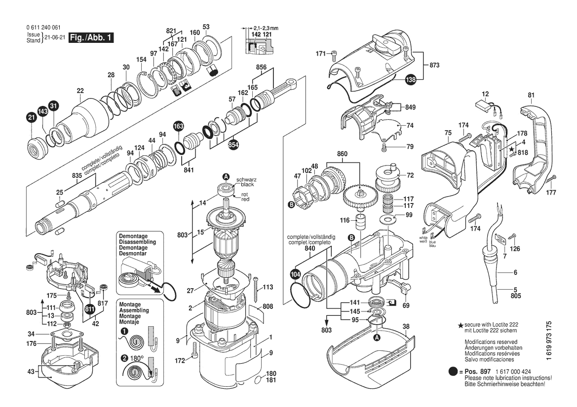 Zeichnung Sollten Sie Fragen zu einem Ersatzteil vom Bosch Bohrhammer GBH 5400 | 230 V | 001 - EU (0 611 240 061) haben, können Sie uns gerne eine E-Mail (mit einem Foto vom Typenschild Ihres Gerätes) schreiben oder eine Ersatzteilanfrage stellen.