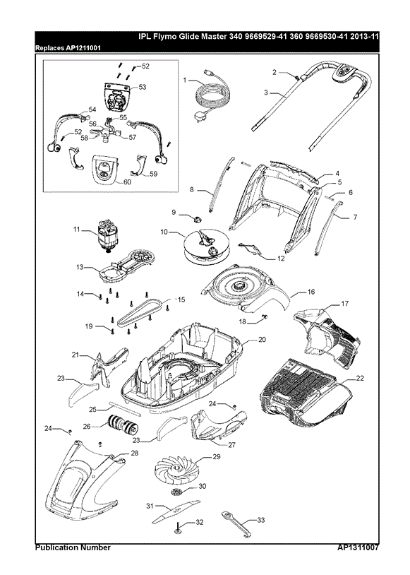 Ersatzteile für Flymo Rasenmäher GLIDEMASTER 360 (ab Nov-2013) aus der Zeichnung 1 Gültig für Artikelnummer: 966953041