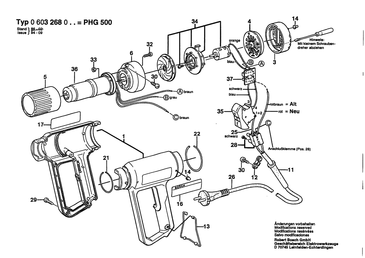 Zeichnung Sollten Sie Fragen zu einem Ersatzteil vom Bosch Heissluftgebläse PHG 500 | 240 V | 027 - AU (0 603 268 037) haben, können Sie uns gerne eine E-Mail (mit einem Foto vom Typenschild Ihres Gerätes) schreiben oder eine Ersatzteilanfrage stellen.