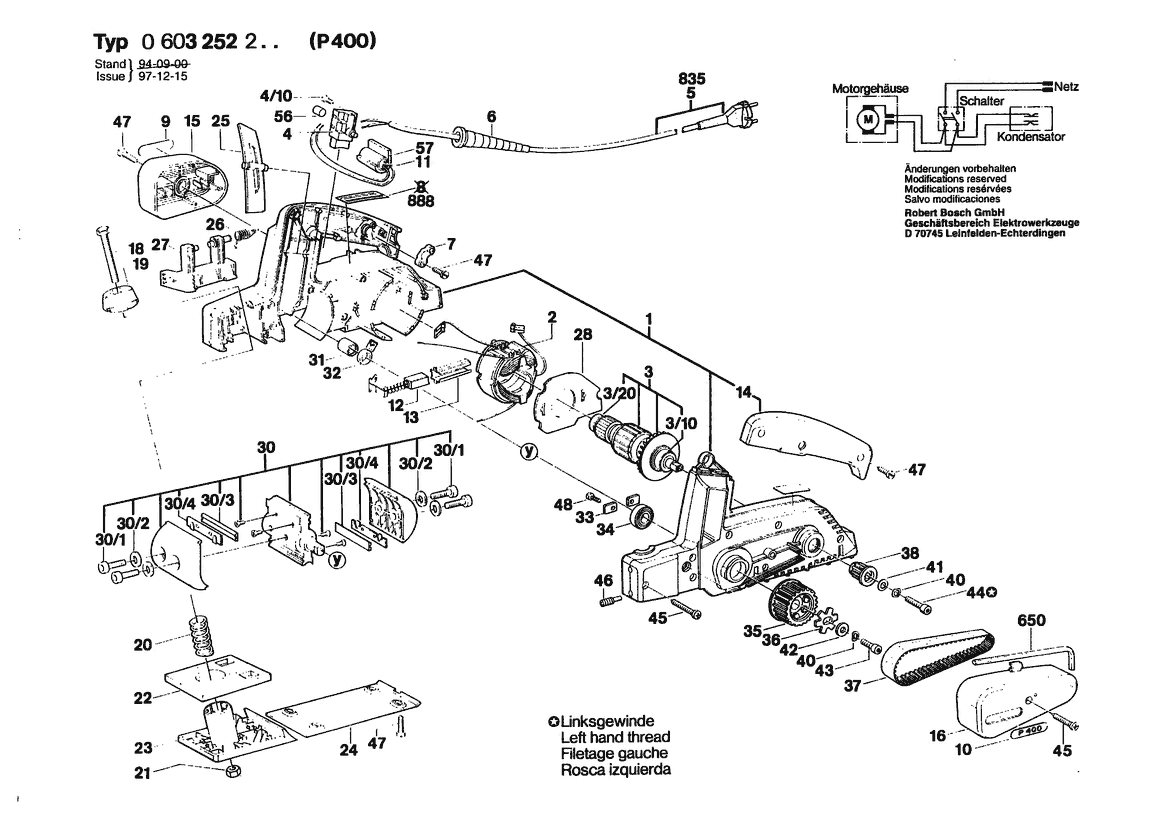 Zeichnung Sollten Sie Fragen zu einem Ersatzteil vom Bosch Handhobel GW-HANDHOBEL | 220 V | 001 - EU (0 603 252 203) haben, können Sie uns gerne eine E-Mail (mit einem Foto vom Typenschild Ihres Gerätes) schreiben oder eine Ersatzteilanfrage stellen.