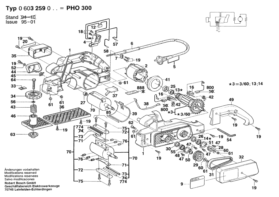 Zeichnung Sollten Sie Fragen zu einem Ersatzteil vom Bosch Handhobel PHO 300 | 240 V | 036 - GB (0 603 259 042) haben, können Sie uns gerne eine E-Mail (mit einem Foto vom Typenschild Ihres Gerätes) schreiben oder eine Ersatzteilanfrage stellen.