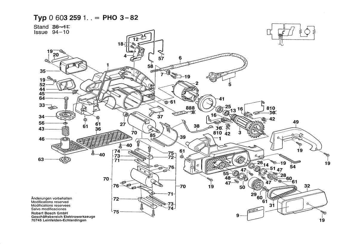 Ersatzteile für Bosch Handhobel PHO 3-82 | 240 V | 036 - GB (0 603 259 142) Zeichnung 1