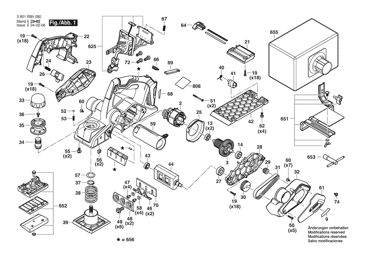 Zeichnung Sollten Sie Fragen zu einem Ersatzteil vom Bosch Handhobel GHO 185-LI | 18 V | 009 - CN (3 601 EB5 080) haben, können Sie uns gerne eine E-Mail (mit einem Foto vom Typenschild Ihres Gerätes) schreiben oder eine Ersatzteilanfrage stellen.