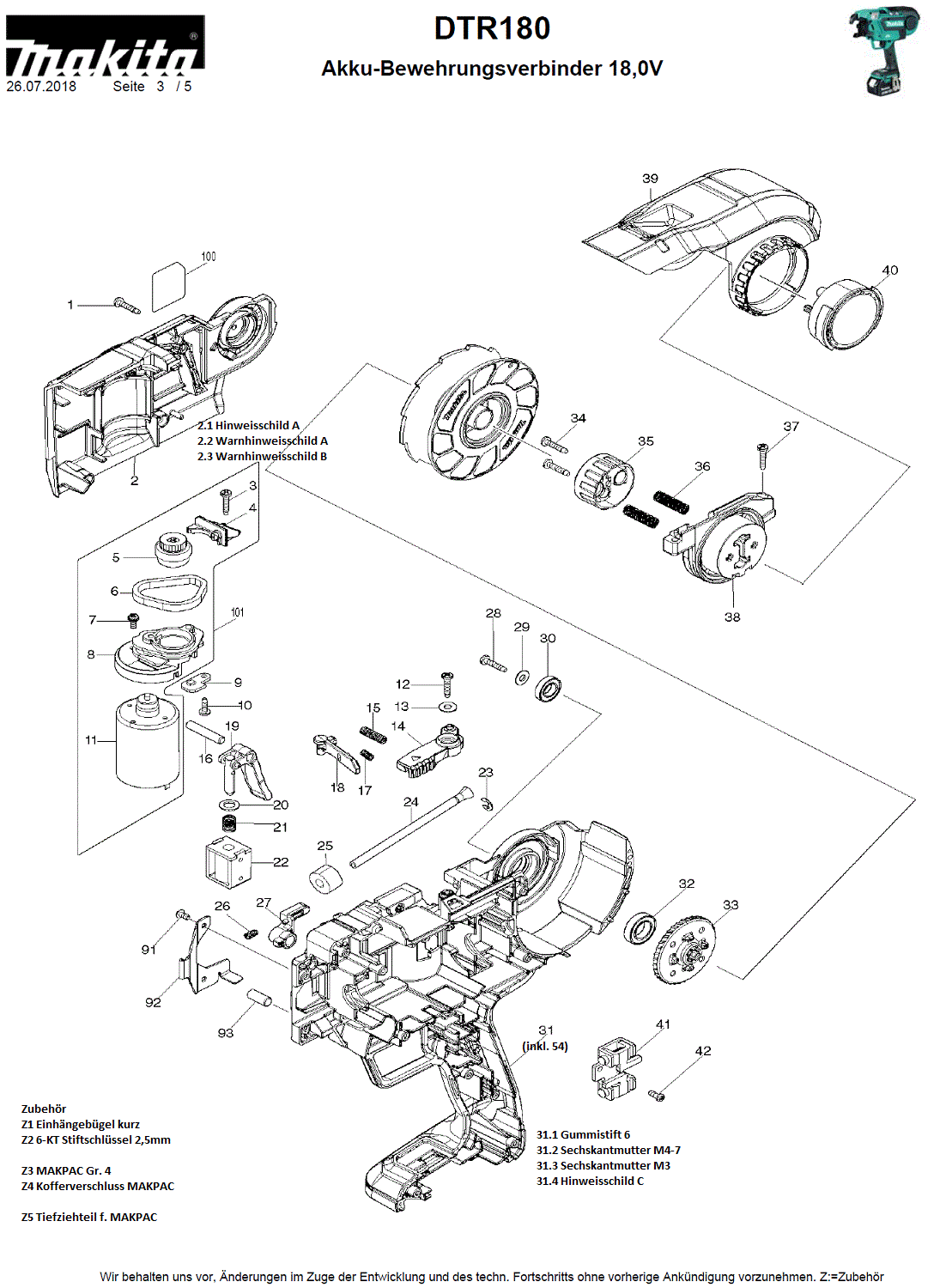 Zeichnung 1 Sollten Sie Fragen zu einem Ersatzteil von Makita DTR180 - Bewehrungsverbinder haben, können Sie uns gerne eine E-Mail (mit einem Foto vom Typenschild Ihres Gerätes) schreiben oder eine Ersatzteilanfrage stellen.