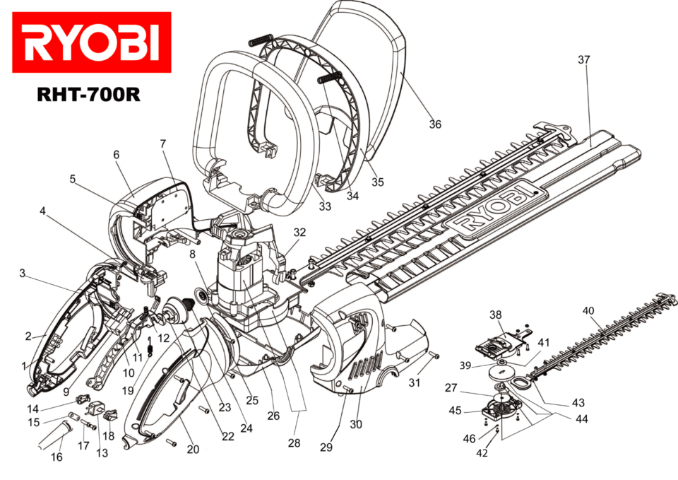 Folgende Ersatzteile für Ryobi Heckenschere RHT700R (5133000017) aus der Zeichnung 1 können Sie hier bestellen: