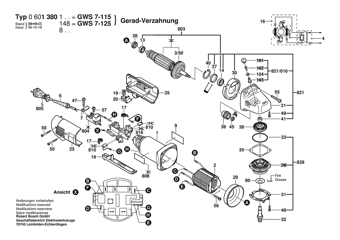 Zeichnung Sollten Sie Fragen zu einem Ersatzteil vom Bosch Winkelschleifer GWS 7-115 | 110 V | 036 - GB (0 601 380 141) haben, können Sie uns gerne eine E-Mail (mit einem Foto vom Typenschild Ihres Gerätes) schreiben oder eine Ersatzteilanfrage stellen.