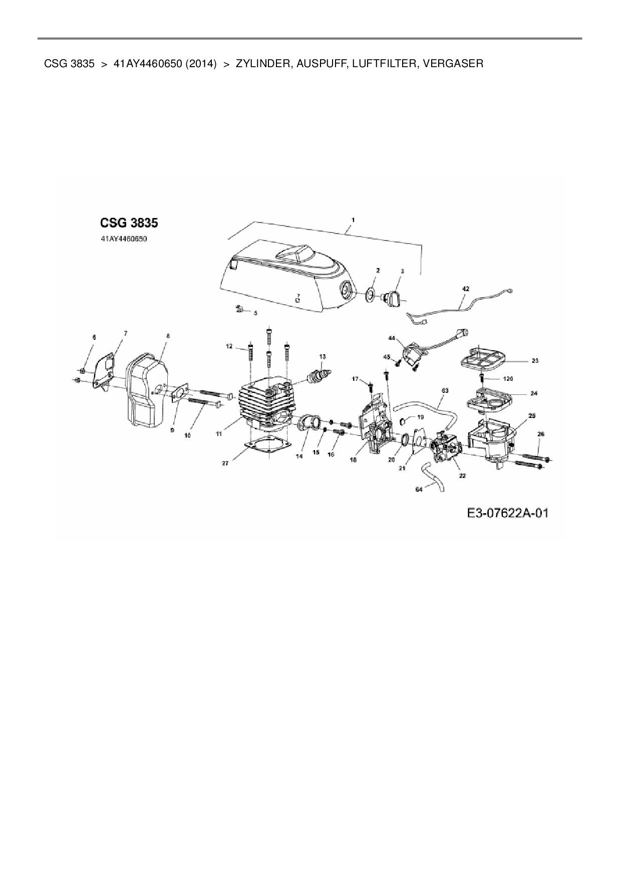 Ersatzteile für Motorkettensäge Wolf-Garten CSG 3835 aus der Zeichnung Zylinder, Auspuff, Luftfilter, Vergaser: