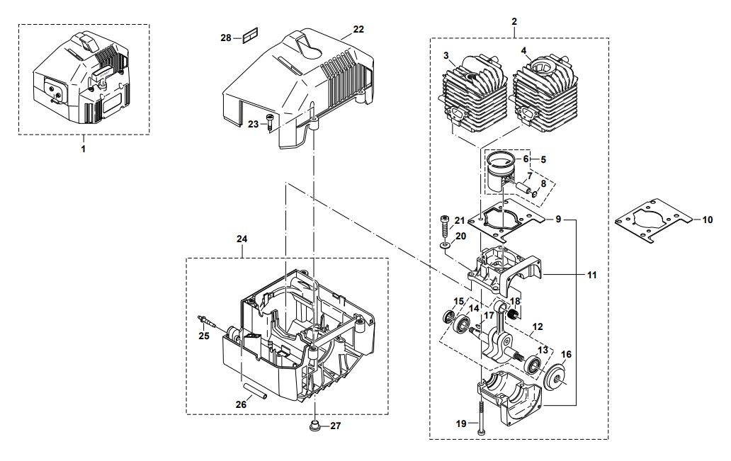 Folgende Ersatzteile für Dolmar Sensen und Trimmer Benzin 2-Takt MS-4510 Zylinder, Kurbelgehäuse, Haube können Sie hier bestellen:
