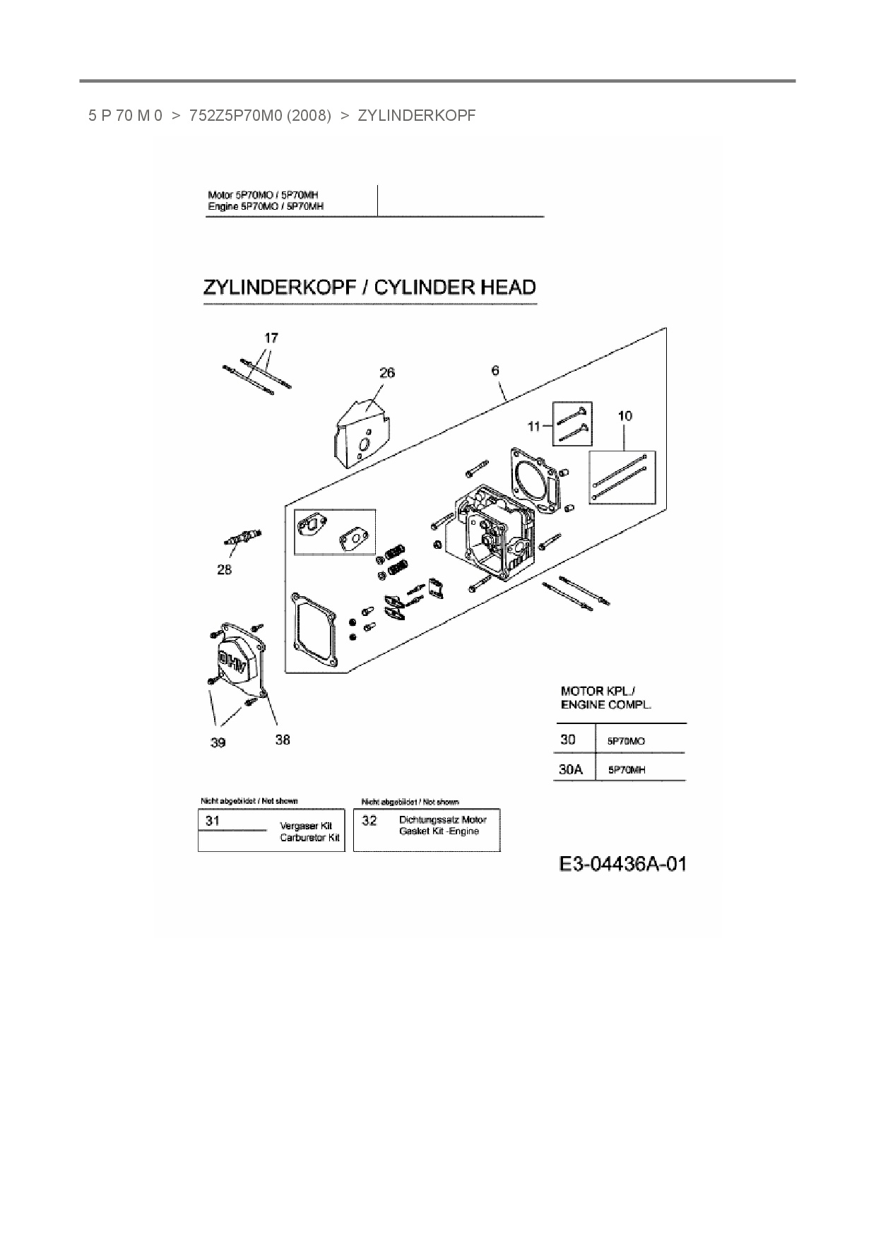 Ersatzteile für Vertikal MTD-Motoren 5 P 70 M 0 aus der Zeichnung Zylinderkopf: