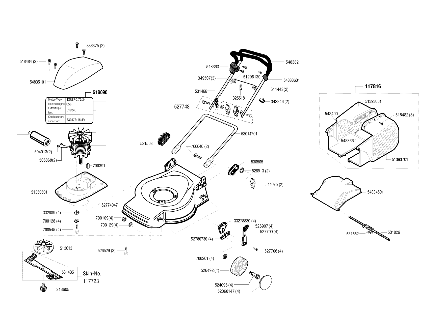 Zeichnungen von Dehner Elektrorasenmäher ELO 42 ab 01/2000 mit der Geräte-Artikelnr. 118077: