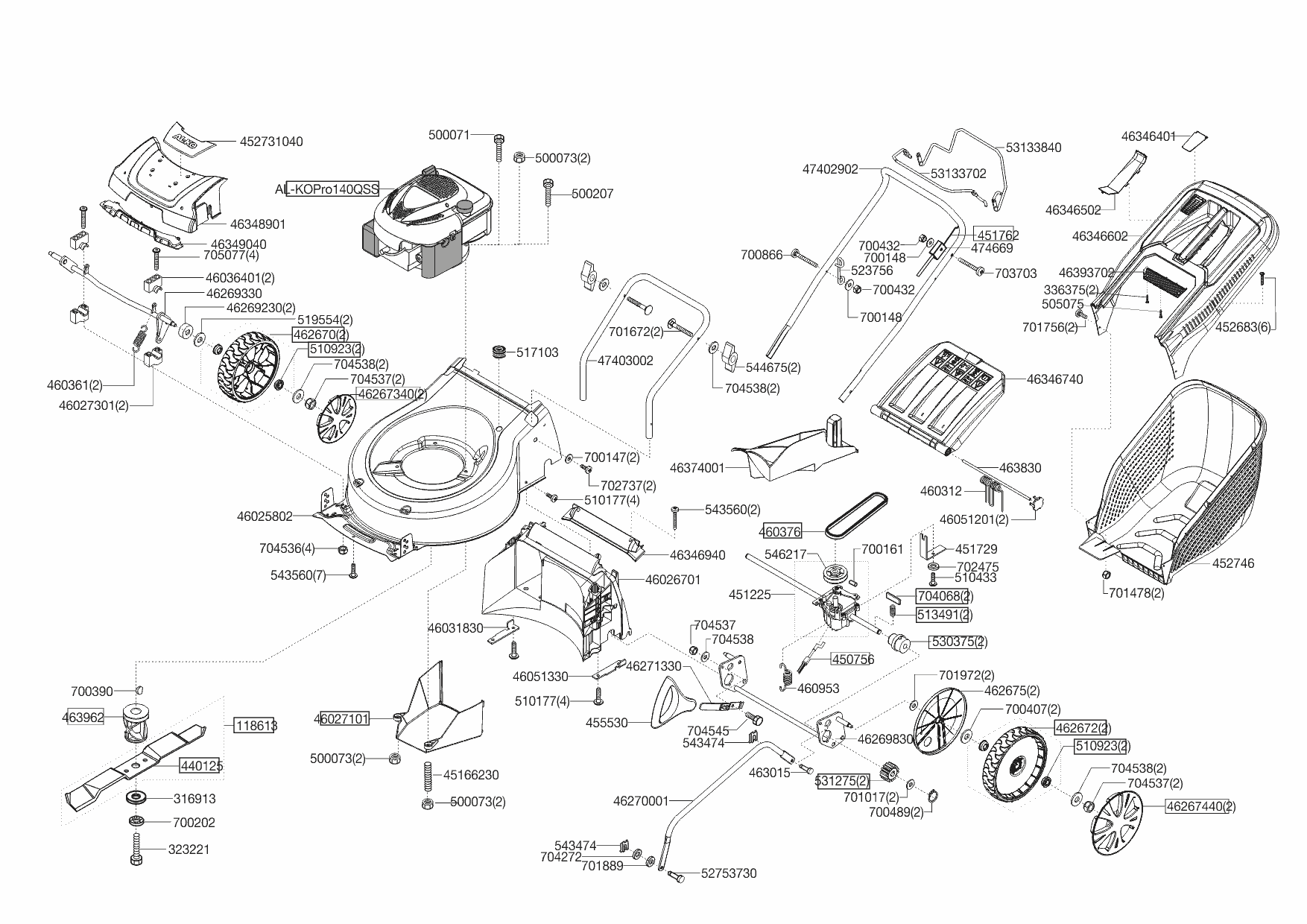 Zeichnungen von Powerline Benzinrasenmäher 4704 SP-A ab 03/2015 mit der Geräte-Artikelnr. 119538: