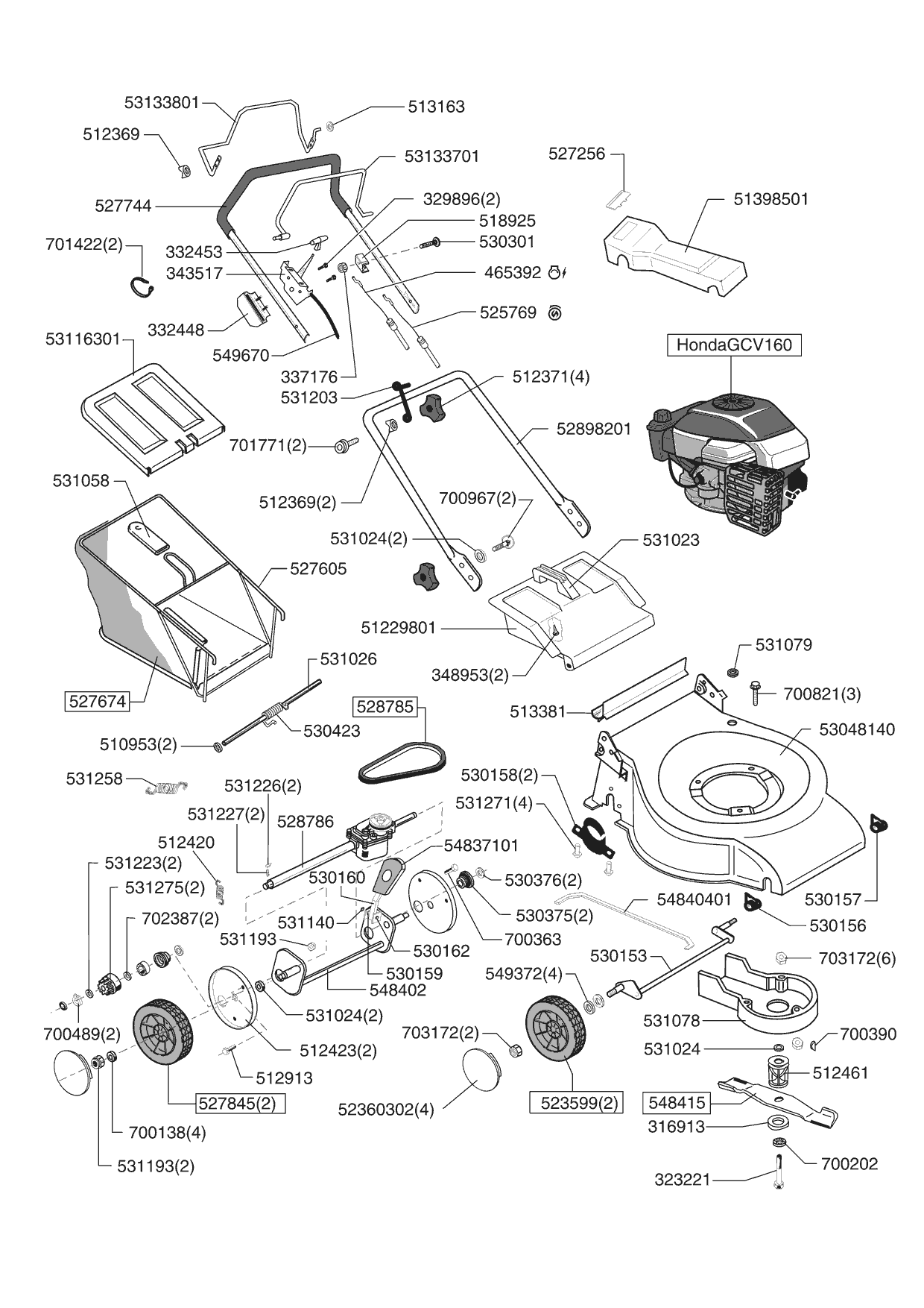 Zeichnungen von Euro Line Benzinrasenmäher 5300 HR ab 05/2004 mit der Geräte-Artikelnr. 121151: