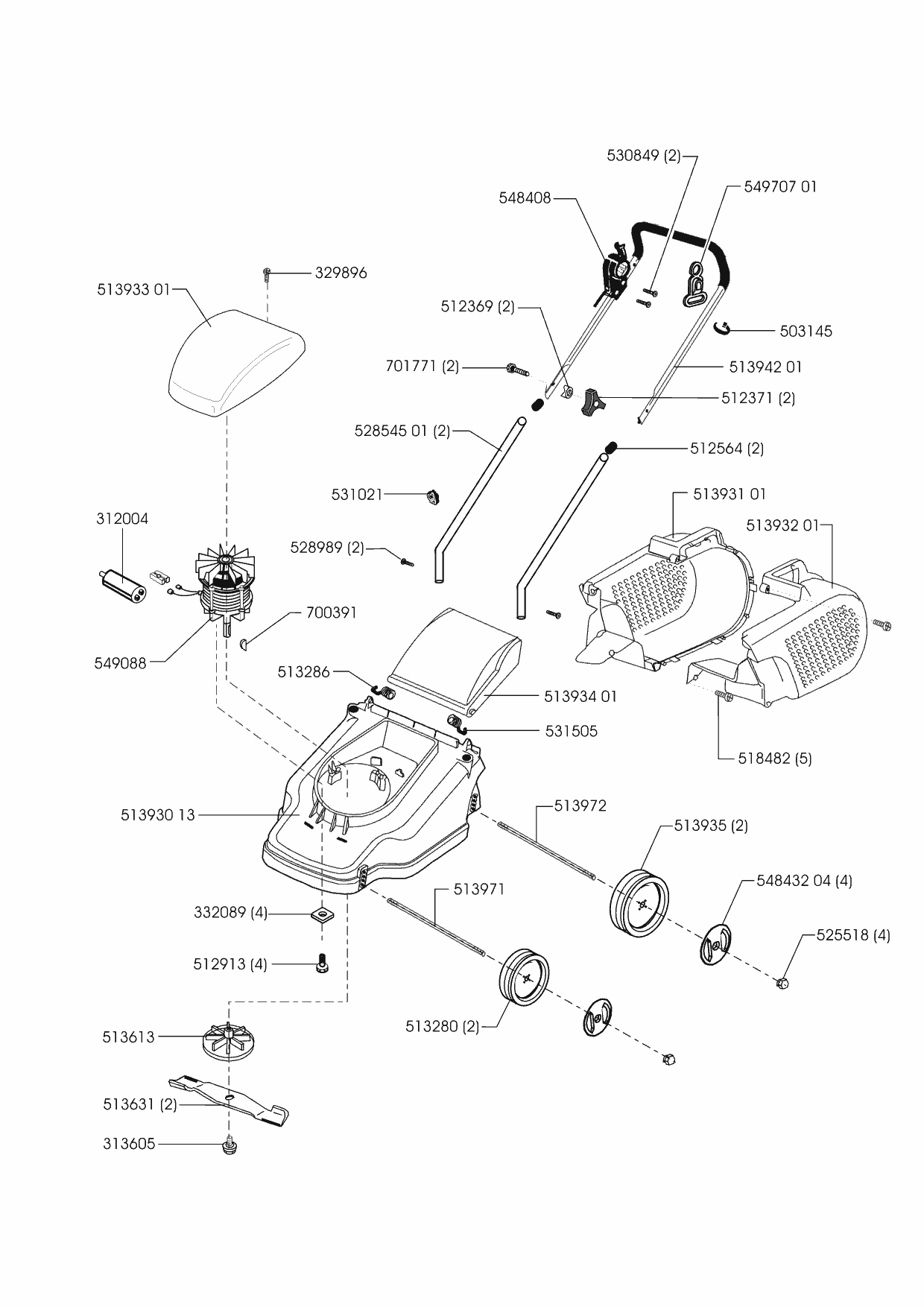 Zeichnungen von Hanseatic Elektrorasenmäher 38 E ab 11/2000 mit der Geräte-Artikelnr. 120945: